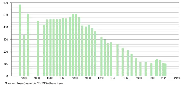 L'évolution du nombre d'habitants est connue à travers les recensements de la population effectués dans la commune depuis 1793. Pour les communes de moins de 10 000 habitants, une enquête de recensement portant sur toute la population est réalisée tous les cinq ans, les populations légales des années intermédiaires étant quant à elles estimées par interpolation ou extrapolation[13]. Pour la commune, le premier recensement exhaustif entrant dans le cadre du nouveau dispositif a été réalisé en 2008[14].