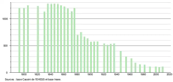 L'évolution du nombre d'habitants est connue à travers les recensements de la population effectués dans la commune depuis 1793. À partir du , les populations légales des communes sont publiées annuellement dans le cadre d'un recensement qui repose désormais sur une collecte d'information annuelle, concernant successivement tous les territoires communaux au cours d'une période de cinq ans. Pour les communes de moins de 10 000 habitants, une enquête de recensement portant sur toute la population est réalisée tous les cinq ans, les populations légales des années intermédiaires étant quant à elles estimées par interpolation ou extrapolation[6]. Pour la commune, le premier recensement exhaustif entrant dans le cadre du nouveau dispositif a été réalisé en 2004[7],[Note 1].