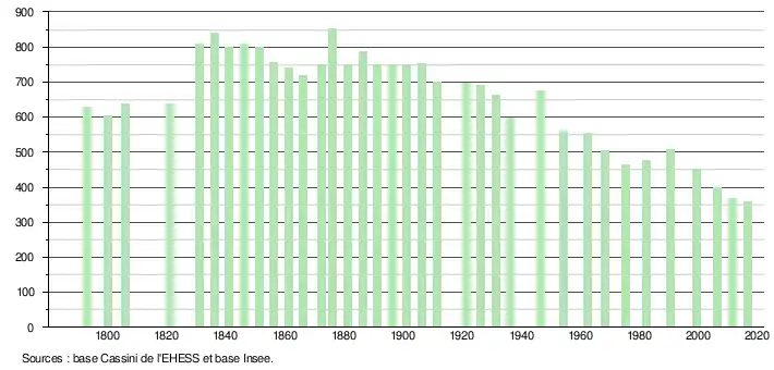 L'évolution du nombre d'habitants est connue à travers les recensements de la population effectués dans la commune depuis 1793. Pour les communes de moins de 10 000 habitants, une enquête de recensement portant sur toute la population est réalisée tous les cinq ans, les populations légales des années intermédiaires étant quant à elles estimées par interpolation ou extrapolation[3]. Pour la commune, le premier recensement exhaustif entrant dans le cadre du nouveau dispositif a été réalisé en 2006[4].