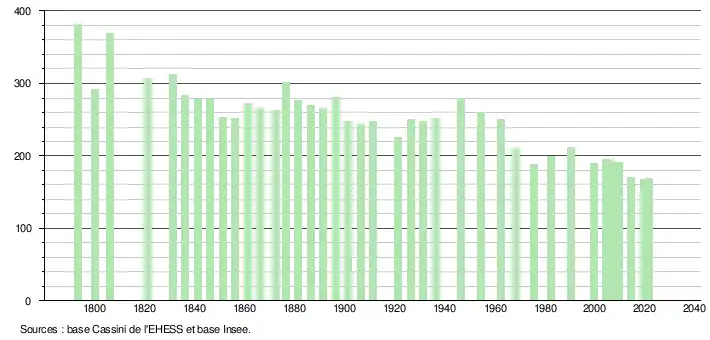 L'évolution du nombre d'habitants est connue à travers les recensements de la population effectués dans la commune depuis 1793. Pour les communes de moins de 10 000 habitants, une enquête de recensement portant sur toute la population est réalisée tous les cinq ans, les populations légales des années intermédiaires étant quant à elles estimées par interpolation ou extrapolation[27]. Pour la commune, le premier recensement exhaustif entrant dans le cadre du nouveau dispositif a été réalisé en 2004[28].