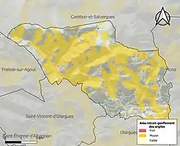 La commune est vulnérable au risque de mouvements de terrains constitué principalement du retrait-gonflement des sols argileux[21]. Cet aléa est susceptible d'engendrer des dommages importants aux bâtiments en cas d’alternance de périodes de sécheresse et de pluie. 55,9 % de la superficie communale est en aléa moyen ou fort (59,3 % au niveau départemental et 48,5 % au niveau national). Sur les 203 bâtiments dénombrés sur la commune en 2019, 71 sont en aléa moyen ou fort, soit 35 %, à comparer aux 85 % au niveau départemental et 54 % au niveau national. Une cartographie de l'exposition du territoire national au retrait gonflement des sols argileux est disponible sur le site du BRGM[22],[Carte 2].