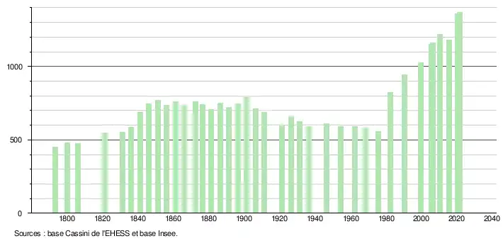 L'évolution du nombre d'habitants est connue à travers les recensements de la population effectués dans la commune depuis 1793. Pour les communes de moins de 10 000 habitants, une enquête de recensement portant sur toute la population est réalisée tous les cinq ans, les populations légales des années intermédiaires étant quant à elles estimées par interpolation ou extrapolation[16]. Pour la commune, le premier recensement exhaustif entrant dans le cadre du nouveau dispositif a été réalisé en 2005[17].