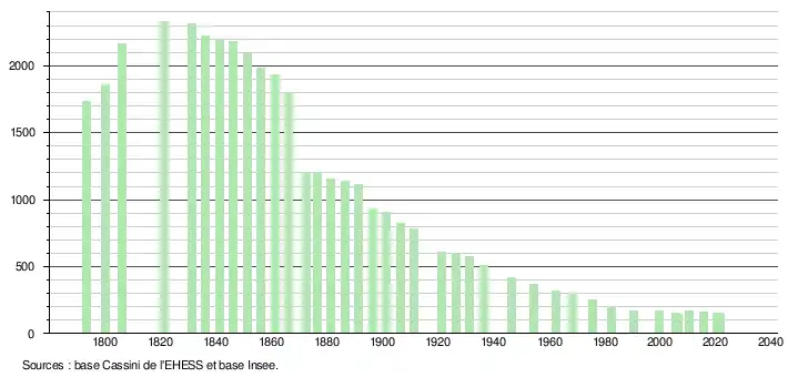 L'évolution du nombre d'habitants est connue à travers les recensements de la population effectués dans la commune depuis 1793. Pour les communes de moins de 10 000 habitants, une enquête de recensement portant sur toute la population est réalisée tous les cinq ans, les populations légales des années intermédiaires étant quant à elles estimées par interpolation ou extrapolation[18]. Pour la commune, le premier recensement exhaustif entrant dans le cadre du nouveau dispositif a été réalisé en 2005[19].