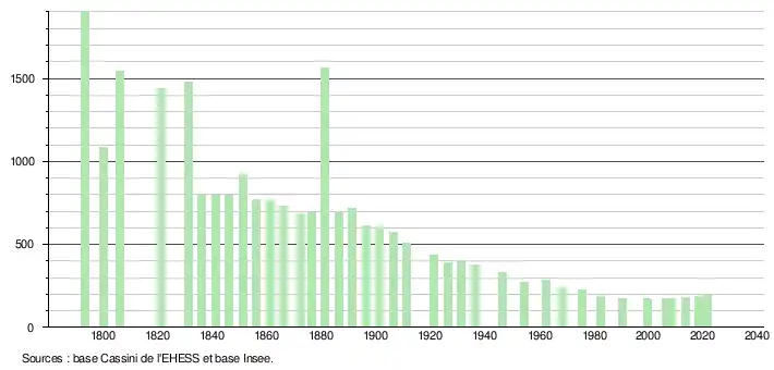 L'évolution du nombre d'habitants est connue à travers les recensements de la population effectués dans la commune depuis 1793. Pour les communes de moins de 10 000 habitants, une enquête de recensement portant sur toute la population est réalisée tous les cinq ans, les populations légales des années intermédiaires étant quant à elles estimées par interpolation ou extrapolation[31]. Pour la commune, le premier recensement exhaustif entrant dans le cadre du nouveau dispositif a été réalisé en 2008[32].