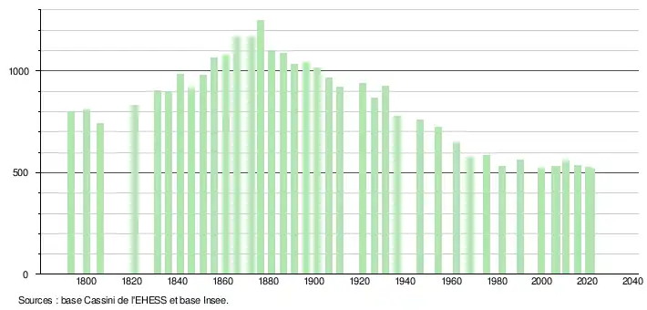 L'évolution du nombre d'habitants est connue à travers les recensements de la population effectués dans la commune depuis 1793. Pour les communes de moins de 10 000 habitants, une enquête de recensement portant sur toute la population est réalisée tous les cinq ans, les populations légales des années intermédiaires étant quant à elles estimées par interpolation ou extrapolation[16]. Pour la commune, le premier recensement exhaustif entrant dans le cadre du nouveau dispositif a été réalisé en 2005[17].