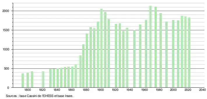 L'évolution du nombre d'habitants est connue à travers les recensements de la population effectués dans la commune depuis 1793. Pour les communes de moins de 10 000 habitants, une enquête de recensement portant sur toute la population est réalisée tous les cinq ans, les populations légales des années intermédiaires étant quant à elles estimées par interpolation ou extrapolation[23]. Pour la commune, le premier recensement exhaustif entrant dans le cadre du nouveau dispositif a été réalisé en 2006[24].