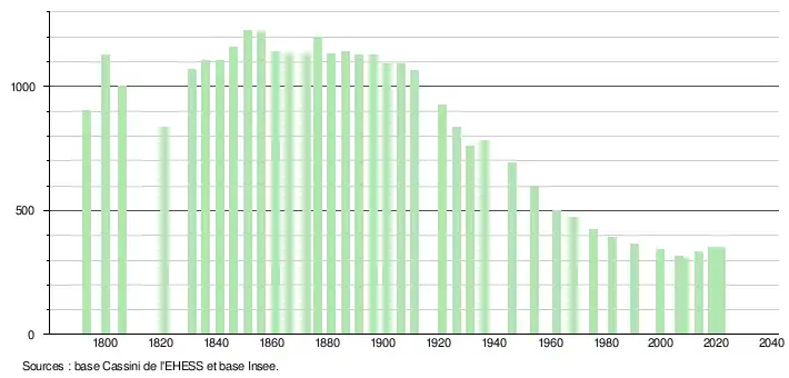 L'évolution du nombre d'habitants est connue à travers les recensements de la population effectués dans la commune depuis 1793. Pour les communes de moins de 10 000 habitants, une enquête de recensement portant sur toute la population est réalisée tous les cinq ans, les populations légales des années intermédiaires étant quant à elles estimées par interpolation ou extrapolation[24]. Pour la commune, le premier recensement exhaustif entrant dans le cadre du nouveau dispositif a été réalisé en 2008[25].