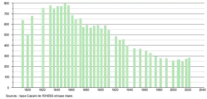 L'évolution du nombre d'habitants est connue à travers les recensements de la population effectués dans la commune depuis 1793. Pour les communes de moins de 10 000 habitants, une enquête de recensement portant sur toute la population est réalisée tous les cinq ans, les populations légales des années intermédiaires étant quant à elles estimées par interpolation ou extrapolation[16]. Pour la commune, le premier recensement exhaustif entrant dans le cadre du nouveau dispositif a été réalisé en 2007[17].