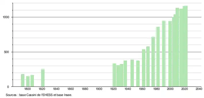 L'évolution du nombre d'habitants est connue à travers les recensements de la population effectués dans la commune depuis 1793. Pour les communes de moins de 10 000 habitants, une enquête de recensement portant sur toute la population est réalisée tous les cinq ans, les populations légales des années intermédiaires étant quant à elles estimées par interpolation ou extrapolation[15]. Pour la commune, le premier recensement exhaustif entrant dans le cadre du nouveau dispositif a été réalisé en 2004[16].