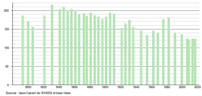 L'évolution du nombre d'habitants est connue à travers les recensements de la population effectués dans la commune depuis 1793. Pour les communes de moins de 10 000 habitants, une enquête de recensement portant sur toute la population est réalisée tous les cinq ans, les populations légales des années intermédiaires étant quant à elles estimées par interpolation ou extrapolation[11]. Pour la commune, le premier recensement exhaustif entrant dans le cadre du nouveau dispositif a été réalisé en 2008[12].