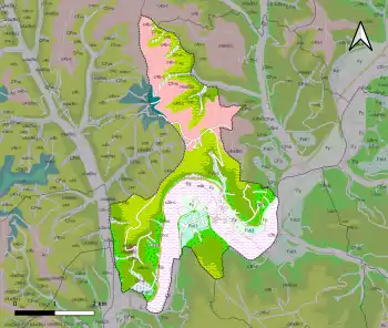 L'occupation des sols de la commune, telle qu'elle ressort de la base de données européenne d’occupation biophysique des sols Corine Land Cover (CLC), est marquée par l'importance des territoires agricoles (50,6 % en 2018), néanmoins en diminution par rapport à 1990 (52,5 %). La répartition détaillée en 2018 est la suivante : forêts (47,6 %), zones agricoles hétérogènes (25,3 %), prairies (18,3 %), terres arables (7 %), zones urbanisées (1,8 %)[31]. L'évolution de l’occupation des sols de la commune et de ses infrastructures peut être observée sur les différentes représentations cartographiques du territoire : la carte de Cassini (XVIIIe siècle), la carte d'état-major (1820-1866) et les cartes ou photos aériennes de l'IGN pour la période actuelle (1950 à aujourd'hui)[Carte 3].
