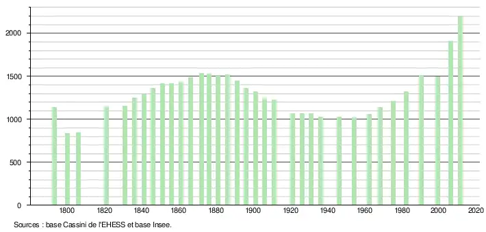 L'évolution du nombre d'habitants est connue à travers les recensements de la population effectués dans la commune depuis 1793. À partir du , les populations légales des communes sont publiées annuellement dans le cadre d'un recensement qui repose désormais sur une collecte d'information annuelle, concernant successivement tous les territoires communaux au cours d'une période de cinq ans. Pour les communes de moins de 10 000 habitants, une enquête de recensement portant sur toute la population est réalisée tous les cinq ans, les populations légales des années intermédiaires étant quant à elles estimées par interpolation ou extrapolation[18]. Pour la commune, le premier recensement exhaustif entrant dans le cadre du nouveau dispositif a été réalisé en 2006[19],[Note 1].