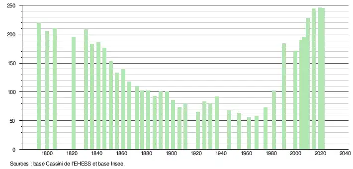 L'évolution du nombre d'habitants est connue à travers les recensements de la population effectués dans la commune depuis 1793. Pour les communes de moins de 10 000 habitants, une enquête de recensement portant sur toute la population est réalisée tous les cinq ans, les populations légales des années intermédiaires étant quant à elles estimées par interpolation ou extrapolation[18]. Pour la commune, le premier recensement exhaustif entrant dans le cadre du nouveau dispositif a été réalisé en 2004[19].