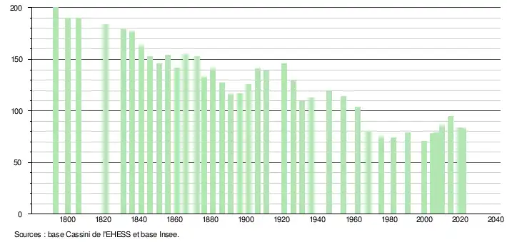 L'évolution du nombre d'habitants est connue à travers les recensements de la population effectués dans la commune depuis 1793. Pour les communes de moins de 10 000 habitants, une enquête de recensement portant sur toute la population est réalisée tous les cinq ans, les populations légales des années intermédiaires étant quant à elles estimées par interpolation ou extrapolation[20]. Pour la commune, le premier recensement exhaustif entrant dans le cadre du nouveau dispositif a été réalisé en 2004[21].