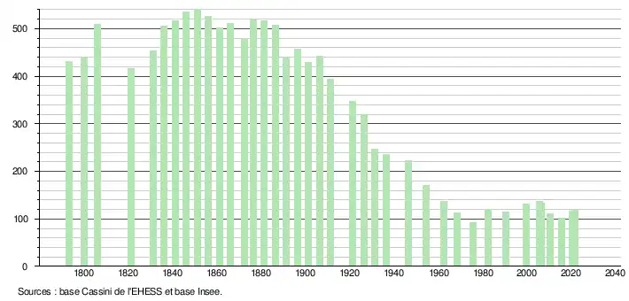 L'évolution du nombre d'habitants est connue à travers les recensements de la population effectués dans la commune depuis 1793. Pour les communes de moins de 10 000 habitants, une enquête de recensement portant sur toute la population est réalisée tous les cinq ans, les populations légales des années intermédiaires étant quant à elles estimées par interpolation ou extrapolation[16]. Pour la commune, le premier recensement exhaustif entrant dans le cadre du nouveau dispositif a été réalisé en 2005[17].