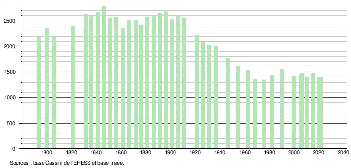 L'évolution du nombre d'habitants est connue à travers les recensements de la population effectués dans la commune depuis 1793. Pour les communes de moins de 10 000 habitants, une enquête de recensement portant sur toute la population est réalisée tous les cinq ans, les populations légales des années intermédiaires étant quant à elles estimées par interpolation ou extrapolation[22]. Pour la commune, le premier recensement exhaustif entrant dans le cadre du nouveau dispositif a été réalisé en 2005[23].