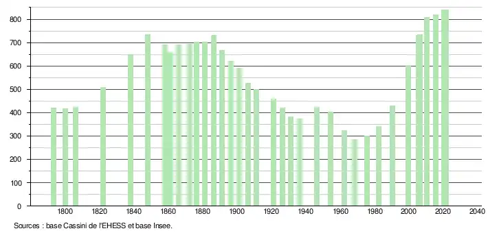 L'évolution du nombre d'habitants est connue à travers les recensements de la population effectués dans la commune depuis 1793. Pour les communes de moins de 10 000 habitants, une enquête de recensement portant sur toute la population est réalisée tous les cinq ans, les populations légales des années intermédiaires étant quant à elles estimées par interpolation ou extrapolation[17]. Pour la commune, le premier recensement exhaustif entrant dans le cadre du nouveau dispositif a été réalisé en 2005[18].
