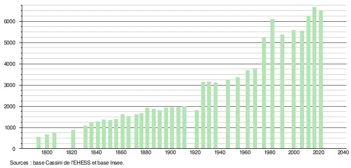 - Population municipale légale en vigueur au 1er janvier 2024, millésimée 2021, définie dans les limites territoriales en vigueur au 1er janvier 2023, date de référence statistique : 1er janvier 2021.