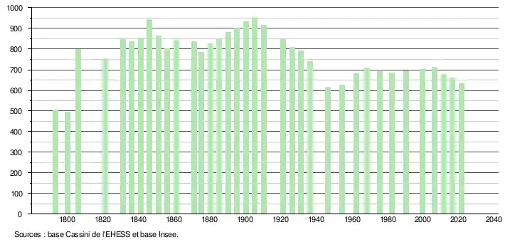 L'évolution du nombre d'habitants est connue à travers les recensements de la population effectués dans la commune depuis 1793. Pour les communes de moins de 10 000 habitants, une enquête de recensement portant sur toute la population est réalisée tous les cinq ans, les populations légales des années intermédiaires étant quant à elles estimées par interpolation ou extrapolation[20]. Pour la commune, le premier recensement exhaustif entrant dans le cadre du nouveau dispositif a été réalisé en 2006[21].