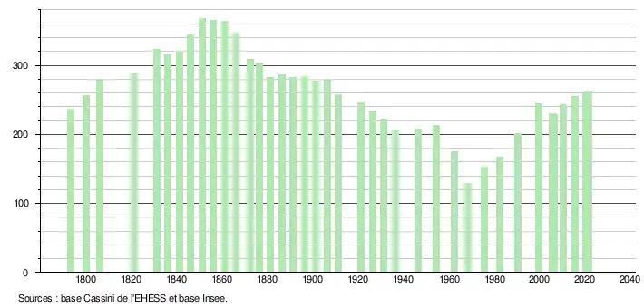 L'évolution du nombre d'habitants est connue à travers les recensements de la population effectués dans la commune depuis 1793. Pour les communes de moins de 10 000 habitants, une enquête de recensement portant sur toute la population est réalisée tous les cinq ans, les populations légales des années intermédiaires étant quant à elles estimées par interpolation ou extrapolation[23]. Pour la commune, le premier recensement exhaustif entrant dans le cadre du nouveau dispositif a été réalisé en 2005[24].