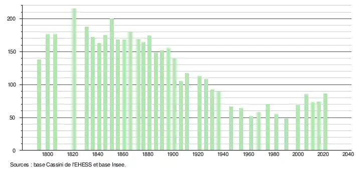 L'évolution du nombre d'habitants est connue à travers les recensements de la population effectués dans la commune depuis 1793. Pour les communes de moins de 10 000 habitants, une enquête de recensement portant sur toute la population est réalisée tous les cinq ans, les populations légales des années intermédiaires étant quant à elles estimées par interpolation ou extrapolation[14]. Pour la commune, le premier recensement exhaustif entrant dans le cadre du nouveau dispositif a été réalisé en 2006[15].