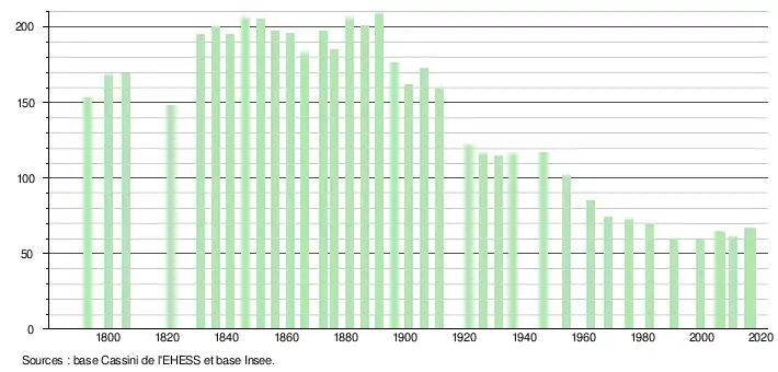 L'évolution du nombre d'habitants est connue à travers les recensements de la population effectués dans la commune depuis 1793. Pour les communes de moins de 10 000 habitants, une enquête de recensement portant sur toute la population est réalisée tous les cinq ans, les populations légales des années intermédiaires étant quant à elles estimées par interpolation ou extrapolation[8]. Pour la commune, le premier recensement exhaustif entrant dans le cadre du nouveau dispositif a été réalisé en 2005[9].