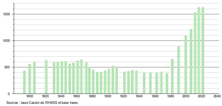 En 2012, la commune comptait 57,7% de couples mariés, 8,6% de divorcés, 27,9% de célibataires et 5,8% de veufs[20]. De plus les familles sont des familles monoparentales à 11,3%, couples sans enfant à 43,4% et des couples avec enfant(s) à 45,3%[20]. Enfin la population était en 2012 composé en majorité de femmes (51,8%)[20].L'évolution du nombre d'habitants est connue à travers les recensements de la population effectués dans la commune depuis 1793. Pour les communes de moins de 10 000 habitants, une enquête de recensement portant sur toute la population est réalisée tous les cinq ans, les populations légales des années intermédiaires étant quant à elles estimées par interpolation ou extrapolation[21]. Pour la commune, le premier recensement exhaustif entrant dans le cadre du nouveau dispositif a été réalisé en 2006[22].