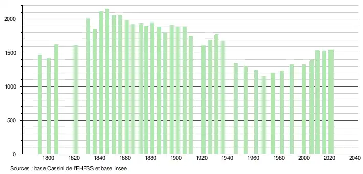 L'évolution du nombre d'habitants est connue à travers les recensements de la population effectués dans la commune depuis 1793. Pour les communes de moins de 10 000 habitants, une enquête de recensement portant sur toute la population est réalisée tous les cinq ans, les populations légales des années intermédiaires étant quant à elles estimées par interpolation ou extrapolation[20]. Pour la commune, le premier recensement exhaustif entrant dans le cadre du nouveau dispositif a été réalisé en 2005[21].