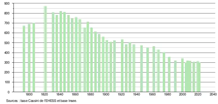 L'évolution du nombre d'habitants est connue à travers les recensements de la population effectués dans la commune depuis 1793. Pour les communes de moins de 10 000 habitants, une enquête de recensement portant sur toute la population est réalisée tous les cinq ans, les populations légales des années intermédiaires étant quant à elles estimées par interpolation ou extrapolation[19]. Pour la commune, le premier recensement exhaustif entrant dans le cadre du nouveau dispositif a été réalisé en 2004[20].