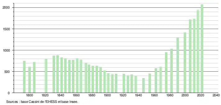 L'évolution du nombre d'habitants est connue à travers les recensements de la population effectués dans la commune depuis 1793. Pour les communes de moins de 10 000 habitants, une enquête de recensement portant sur toute la population est réalisée tous les cinq ans, les populations légales des années intermédiaires étant quant à elles estimées par interpolation ou extrapolation[24]. Pour la commune, le premier recensement exhaustif entrant dans le cadre du nouveau dispositif a été réalisé en 2006[25].