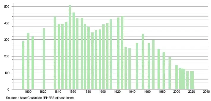 L'évolution du nombre d'habitants est connue à travers les recensements de la population effectués dans la commune depuis 1793. Pour les communes de moins de 10 000 habitants, une enquête de recensement portant sur toute la population est réalisée tous les cinq ans, les populations légales des années intermédiaires étant quant à elles estimées par interpolation ou extrapolation[16]. Pour la commune, le premier recensement exhaustif entrant dans le cadre du nouveau dispositif a été réalisé en 2004[17].