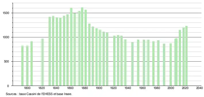 L'évolution du nombre d'habitants est connue à travers les recensements de la population effectués dans la commune depuis 1793. Pour les communes de moins de 10 000 habitants, une enquête de recensement portant sur toute la population est réalisée tous les cinq ans, les populations légales des années intermédiaires étant quant à elles estimées par interpolation ou extrapolation[14]. Pour la commune, le premier recensement exhaustif entrant dans le cadre du nouveau dispositif a été réalisé en 2007[15].