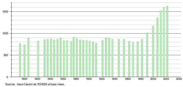 L'évolution du nombre d'habitants est connue à travers les recensements de la population effectués dans la commune depuis 1793. Pour les communes de moins de 10 000 habitants, une enquête de recensement portant sur toute la population est réalisée tous les cinq ans, les populations légales des années intermédiaires étant quant à elles estimées par interpolation ou extrapolation[21]. Pour la commune, le premier recensement exhaustif entrant dans le cadre du nouveau dispositif a été réalisé en 2006[22].