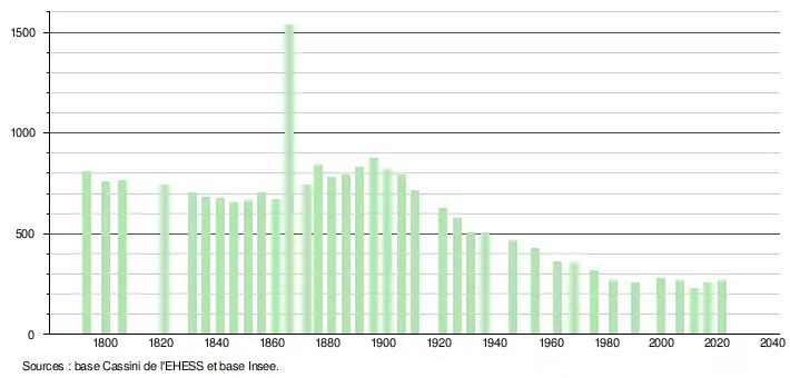 L'évolution du nombre d'habitants est connue à travers les recensements de la population effectués dans la commune depuis 1793. Pour les communes de moins de 10 000 habitants, une enquête de recensement portant sur toute la population est réalisée tous les cinq ans, les populations légales des années intermédiaires étant quant à elles estimées par interpolation ou extrapolation[25]. Pour la commune, le premier recensement exhaustif entrant dans le cadre du nouveau dispositif a été réalisé en 2006[26].