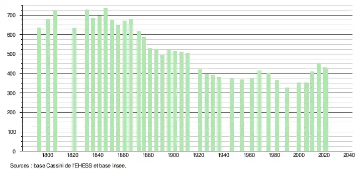 L'évolution du nombre d'habitants est connue à travers les recensements de la population effectués dans la commune depuis 1793. Pour les communes de moins de 10 000 habitants, une enquête de recensement portant sur toute la population est réalisée tous les cinq ans, les populations légales des années intermédiaires étant quant à elles estimées par interpolation ou extrapolation[17]. Pour la commune, le premier recensement exhaustif entrant dans le cadre du nouveau dispositif a été réalisé en 2005[18].