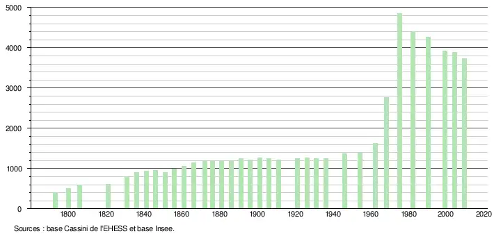 L'évolution du nombre d'habitants est connue à travers les recensements de la population effectués dans la commune depuis 1793. À partir du , les populations légales des communes sont publiées annuellement dans le cadre d'un recensement qui repose désormais sur une collecte d'information annuelle, concernant successivement tous les territoires communaux au cours d'une période de cinq ans. Pour les communes de moins de 10 000 habitants, une enquête de recensement portant sur toute la population est réalisée tous les cinq ans, les populations légales des années intermédiaires étant quant à elles estimées par interpolation ou extrapolation[10]. Pour la commune, le premier recensement exhaustif entrant dans le cadre du nouveau dispositif a été réalisé en 2004[11],[Note 1].