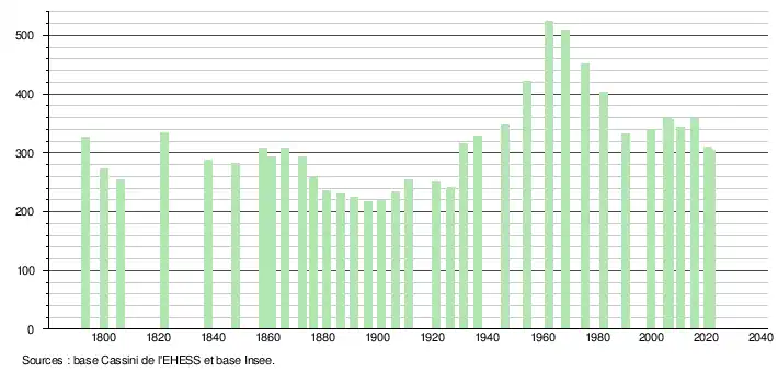L'évolution du nombre d'habitants est connue à travers les recensements de la population effectués dans la commune depuis 1793. Pour les communes de moins de 10 000 habitants, une enquête de recensement portant sur toute la population est réalisée tous les cinq ans, les populations légales des années intermédiaires étant quant à elles estimées par interpolation ou extrapolation[12]. Pour la commune, le premier recensement exhaustif entrant dans le cadre du nouveau dispositif a été réalisé en 2005[13].