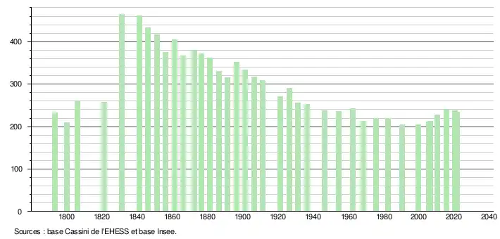 L'évolution du nombre d'habitants est connue à travers les recensements de la population effectués dans la commune depuis 1793. Pour les communes de moins de 10 000 habitants, une enquête de recensement portant sur toute la population est réalisée tous les cinq ans, les populations légales des années intermédiaires étant quant à elles estimées par interpolation ou extrapolation[22]. Pour la commune, le premier recensement exhaustif entrant dans le cadre du nouveau dispositif a été réalisé en 2005[23].