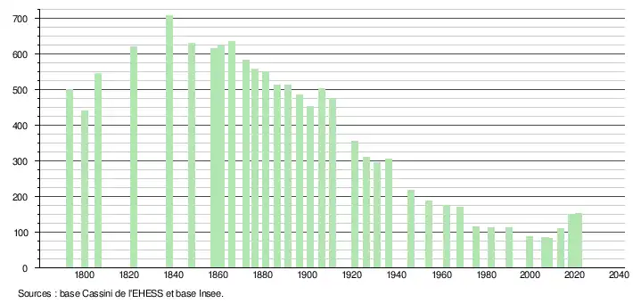 L'évolution du nombre d'habitants est connue à travers les recensements de la population effectués dans la commune depuis 1793. Pour les communes de moins de 10 000 habitants, une enquête de recensement portant sur toute la population est réalisée tous les cinq ans, les populations légales des années intermédiaires étant quant à elles estimées par interpolation ou extrapolation[16]. Pour la commune, le premier recensement exhaustif entrant dans le cadre du nouveau dispositif a été réalisé en 2008[17].