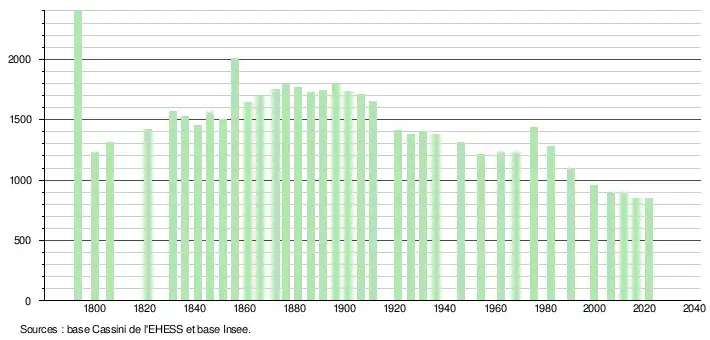 L'évolution du nombre d'habitants est connue à travers les recensements de la population effectués dans la commune depuis 1793. Pour les communes de moins de 10 000 habitants, une enquête de recensement portant sur toute la population est réalisée tous les cinq ans, les populations légales des années intermédiaires étant quant à elles estimées par interpolation ou extrapolation[15]. Pour la commune, le premier recensement exhaustif entrant dans le cadre du nouveau dispositif a été réalisé en 2006[16].