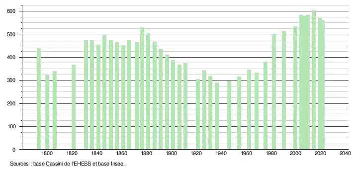L'évolution du nombre d'habitants est connue à travers les recensements de la population effectués dans la commune depuis 1793. Pour les communes de moins de 10 000 habitants, une enquête de recensement portant sur toute la population est réalisée tous les cinq ans, les populations légales des années intermédiaires étant quant à elles estimées par interpolation ou extrapolation[20]. Pour la commune, le premier recensement exhaustif entrant dans le cadre du nouveau dispositif a été réalisé en 2004[21].