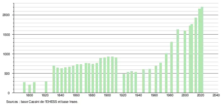 L'évolution du nombre d'habitants est connue à travers les recensements de la population effectués dans la commune depuis 1793. Pour les communes de moins de 10 000 habitants, une enquête de recensement portant sur toute la population est réalisée tous les cinq ans, les populations légales des années intermédiaires étant quant à elles estimées par interpolation ou extrapolation[21]. Pour la commune, le premier recensement exhaustif entrant dans le cadre du nouveau dispositif a été réalisé en 2008[22].
