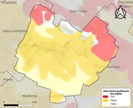Le retrait-gonflement des sols argileux est susceptible d'engendrer des dommages importants aux bâtiments en cas d’alternance de périodes de sécheresse et de pluie. 73,3 % de la superficie communale est en aléa moyen ou fort (52,8 % au niveau départemental et 48,5 % au niveau national). Sur les 675 bâtiments dénombrés sur la commune en 2019, 671 sont en aléa moyen ou fort, soit 99 %, à comparer aux 70 % au niveau départemental et 54 % au niveau national. Une cartographie de l'exposition du territoire national au retrait gonflement des sols argileux est disponible sur le site du BRGM[17],[Carte 2].