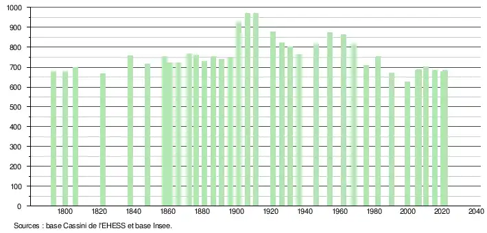 L'évolution du nombre d'habitants est connue à travers les recensements de la population effectués dans la commune depuis 1793. Pour les communes de moins de 10 000 habitants, une enquête de recensement portant sur toute la population est réalisée tous les cinq ans, les populations légales des années intermédiaires étant quant à elles estimées par interpolation ou extrapolation[13]. Pour la commune, le premier recensement exhaustif entrant dans le cadre du nouveau dispositif a été réalisé en 2005[14].