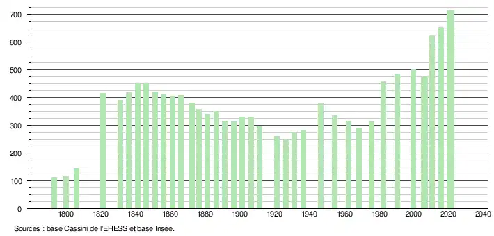L'évolution du nombre d'habitants est connue à travers les recensements de la population effectués dans la commune depuis 1793. Pour les communes de moins de 10 000 habitants, une enquête de recensement portant sur toute la population est réalisée tous les cinq ans, les populations légales des années intermédiaires étant quant à elles estimées par interpolation ou extrapolation[28]. Pour la commune, le premier recensement exhaustif entrant dans le cadre du nouveau dispositif a été réalisé en 2005[29].