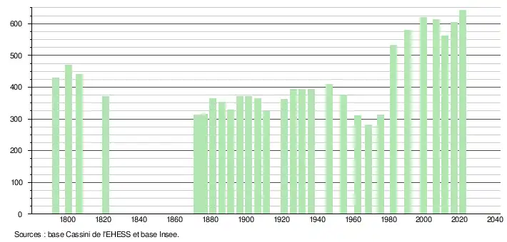 L'évolution du nombre d'habitants est connue à travers les recensements de la population effectués dans la commune depuis 1793. Pour les communes de moins de 10 000 habitants, une enquête de recensement portant sur toute la population est réalisée tous les cinq ans, les populations légales des années intermédiaires étant quant à elles estimées par interpolation ou extrapolation[24]. Pour la commune, le premier recensement exhaustif entrant dans le cadre du nouveau dispositif a été réalisé en 2006[25].