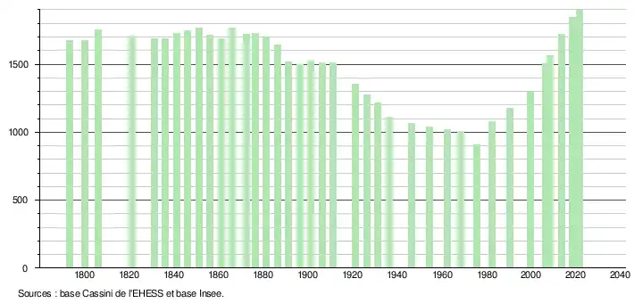 L'évolution du nombre d'habitants est connue à travers les recensements de la population effectués dans la commune depuis 1793. Pour les communes de moins de 10 000 habitants, une enquête de recensement portant sur toute la population est réalisée tous les cinq ans, les populations légales des années intermédiaires étant quant à elles estimées par interpolation ou extrapolation[25]. Pour la commune, le premier recensement exhaustif entrant dans le cadre du nouveau dispositif a été réalisé en 2008[26].