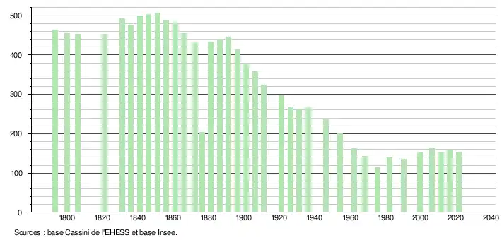 L'évolution du nombre d'habitants est connue à travers les recensements de la population effectués dans la commune depuis 1793. Pour les communes de moins de 10 000 habitants, une enquête de recensement portant sur toute la population est réalisée tous les cinq ans, les populations légales des années intermédiaires étant quant à elles estimées par interpolation ou extrapolation[17]. Pour la commune, le premier recensement exhaustif entrant dans le cadre du nouveau dispositif a été réalisé en 2006[18].