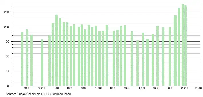 L'évolution du nombre d'habitants est connue à travers les recensements de la population effectués dans la commune depuis 1793. Pour les communes de moins de 10 000 habitants, une enquête de recensement portant sur toute la population est réalisée tous les cinq ans, les populations légales des années intermédiaires étant quant à elles estimées par interpolation ou extrapolation[27]. Pour la commune, le premier recensement exhaustif entrant dans le cadre du nouveau dispositif a été réalisé en 2007[28].