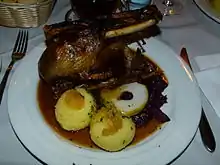 On avance également l’hypothèse historique suivante pour expliquer la légende de l’oie : le Martinschoß, un vasselage échu le jour de la Saint-Martin à l’époque féodale, en serait l’origine[3]. Comme il s’agissait souvent d’une oie, elle fut qualifiée d’oie de la Saint-Martin, et comme ce jour-là était traditionnellement célébré par une kermesse ou une soirée dansante, il parut approprié de désigner l’oie comme élément principal du festin et de la déguster dans une ambiance festive[4]. En Allemagne, il est coutume d’accompagner l’oie de chou rouge et de quenelles ou de viande, de poisson ou de pommes de terre.